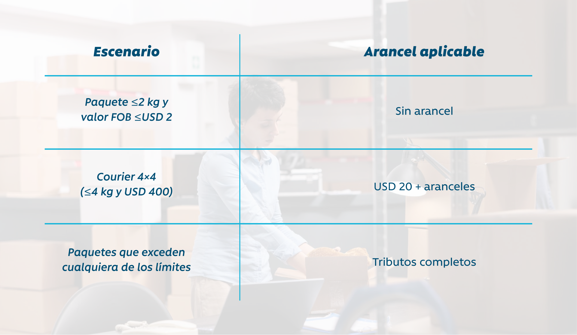 Si el paquete pesa ≤2 kg y tiene valor FOB ≤USD 2: No paga aranceles.